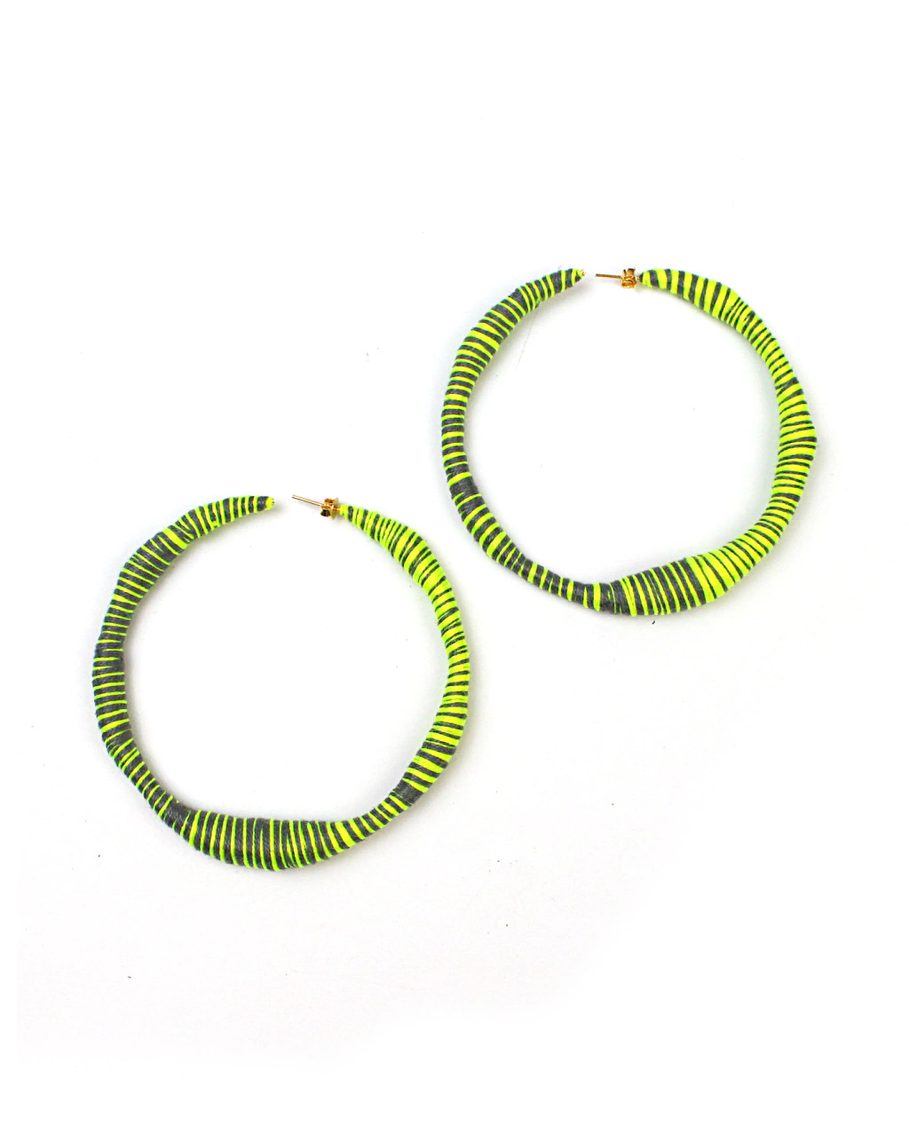 O Brinco Duna é uma argola feita à mão com fios de algodão nas cores amarelo lima neon e cinza. Seu formato orgânico transforma um clássico, as argolas, em uma peça contemporânea e cheia de estilo.